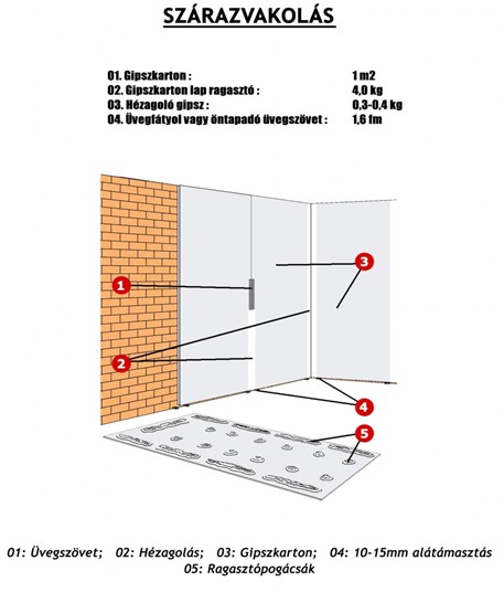 - Szárazvakolat előírásnak megfelelő ragasztása